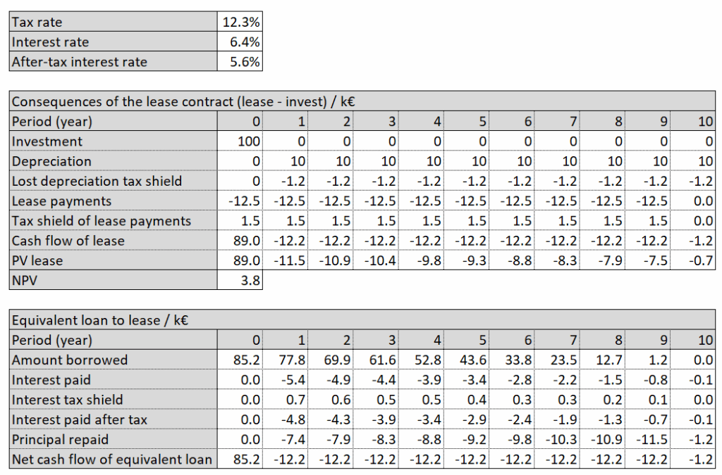 In an additional table you can see the calculation of the equivalent loan leading to the same cash flows as the leasing contract. In our example is 3.8 k€. That means that leasing is better than investing and should be preferred.