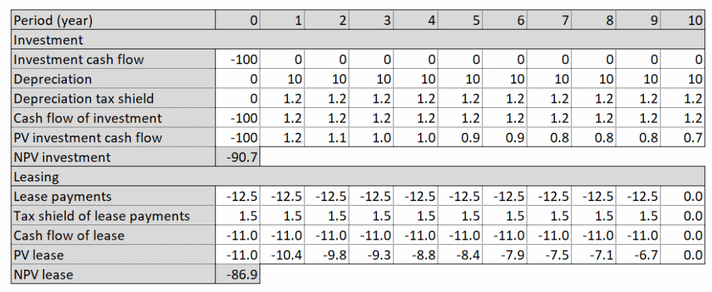 We want to decide whether it is better to make an investment of 100 thousand Euro (k€) or to lease it with annual payments of 12.5 k€. The investment is usable for 10 years and has a no salvage value. The lease payments have to be done in advance and are constant over 10 years. In the table below you can see the consequences of leasing the asset compared to make the investment. Leasing reduces your depreciation, and as a consequence the tax shield because of depreciation is lost. On the other hand the lease payments are fully tax-deductible. We discount the cash flows by the company’s borrowing rate. We can deduct the interest payments from the taxable income. Hence the net cost of borrowing is the after-tax interest rate. So the after-tax interest rate is the effective rate at which a company can transfer debt-equivalent cash flows from one time period to another. With an interest rate